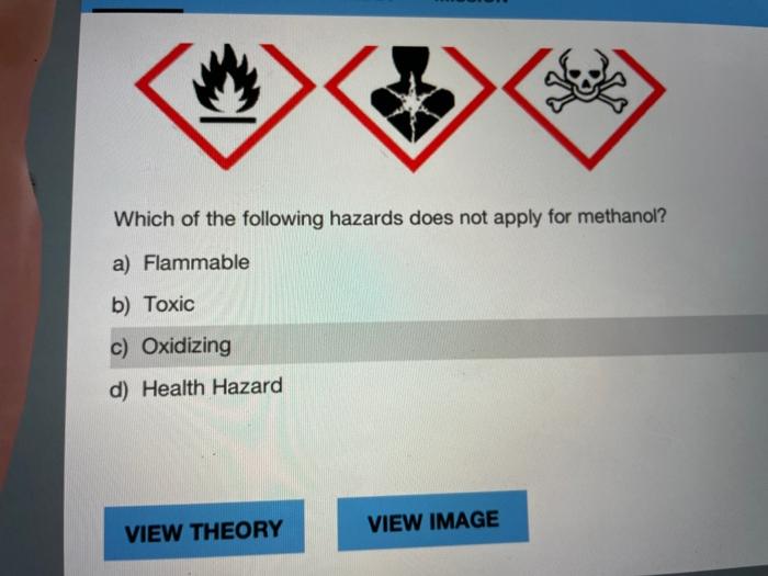 Solved Which Of The Following Hazards Does Not Apply For Methanol Flammable B Toxic Oxidizing Health Hazard View Theory Viiew Image